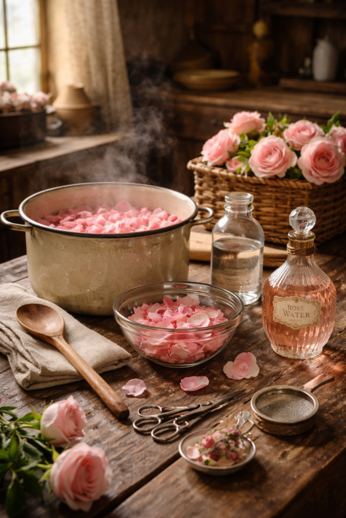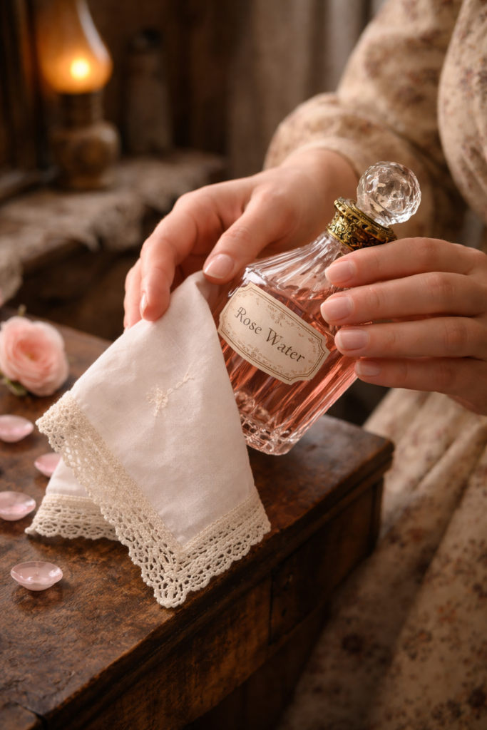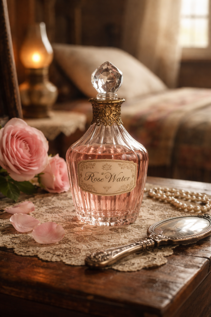 That is why an old-fashioned image of rose water feels so lovely: a small bottle, a folded handkerchief, a handful of petals, and a quiet morning light across the room.